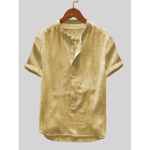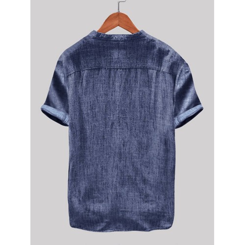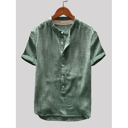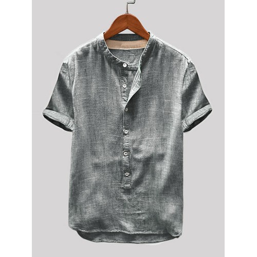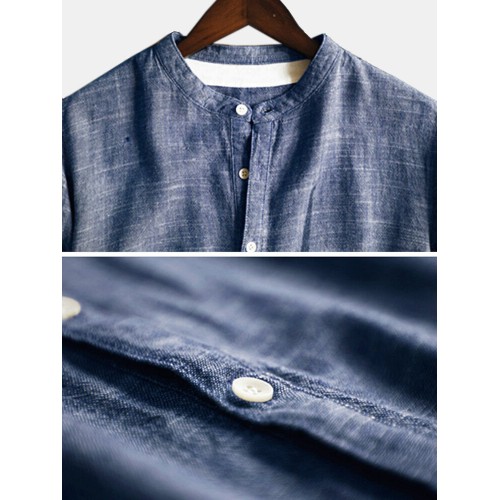 Mens Cotton Linen Vintage Solid Stand Collar Casual Henley Shirt