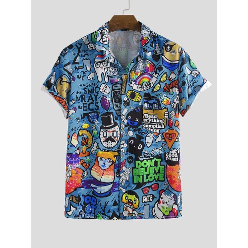 Mens Cartoon Graffiti Printed Turn Down Collar Short Sleeve Shirts