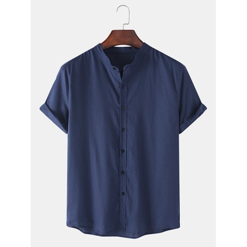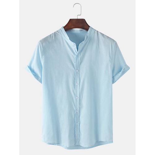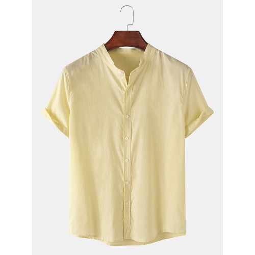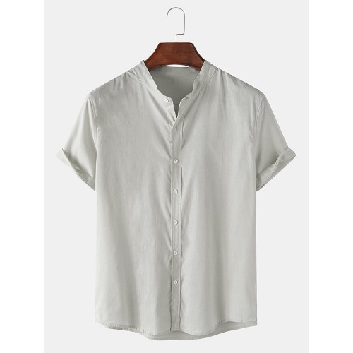 Mens Breathable Flax Stand Collar Solid Color Short Sleeve Shirt