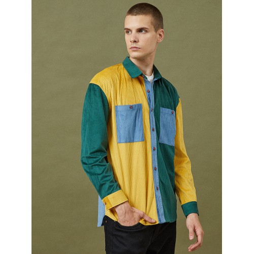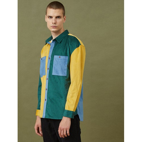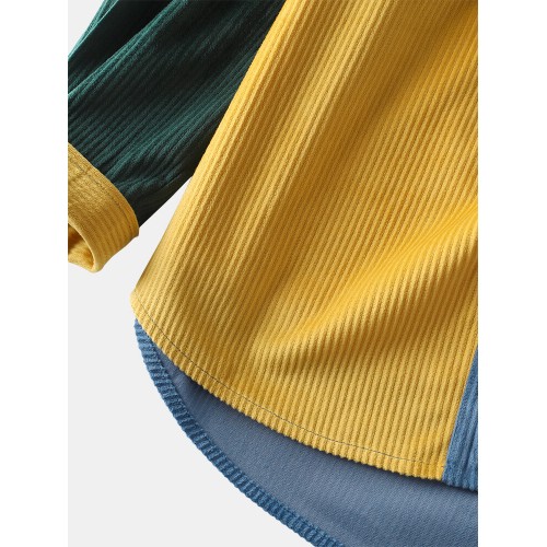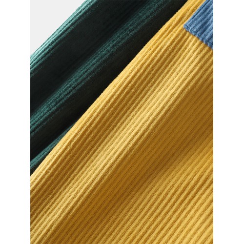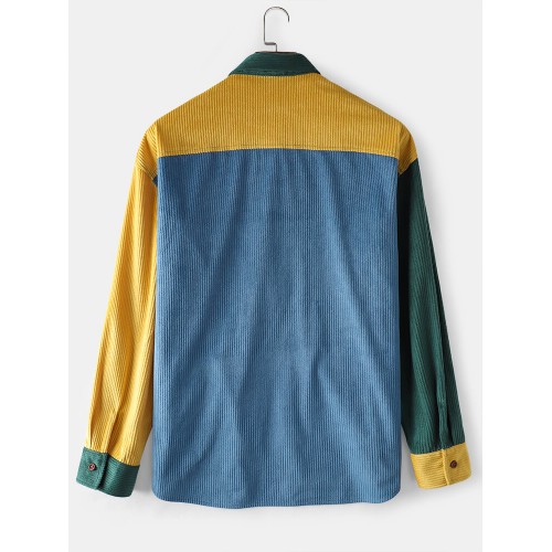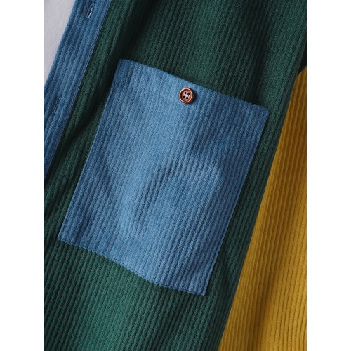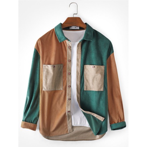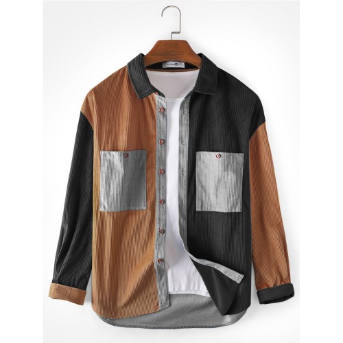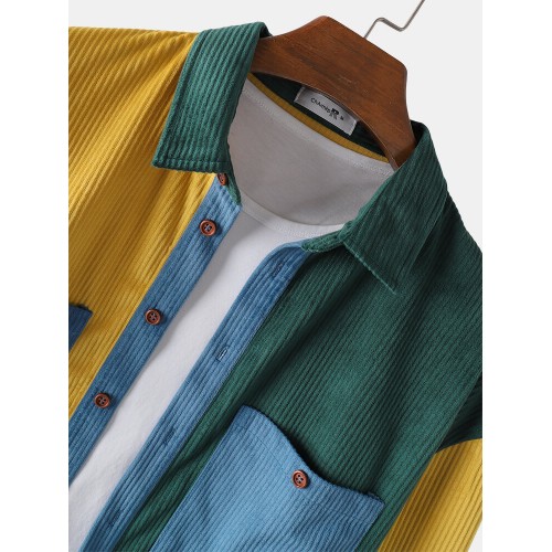 Mens Patchwork Colorblock Double Pocket Corduroy Lapel Long Sleeve Shirts