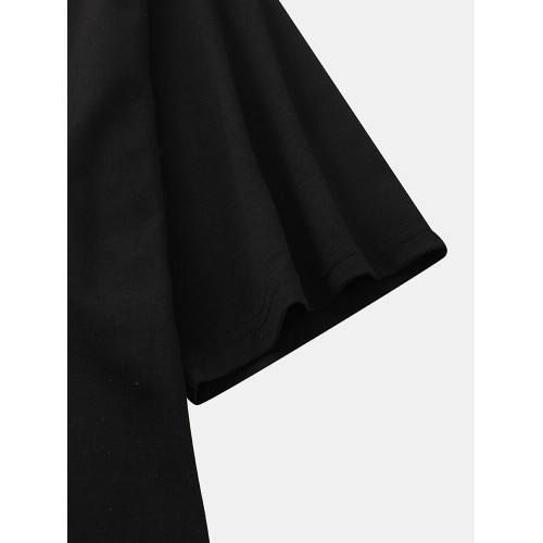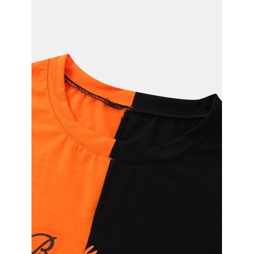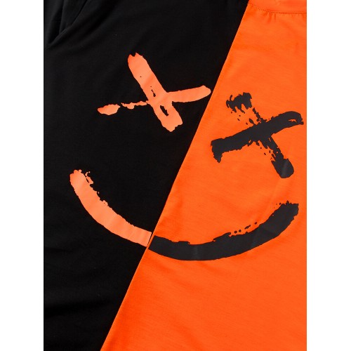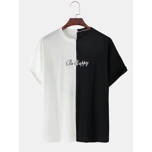 Mens Contrast Patchwork Happy Face Letter Print Cotton Loose Short Sleeve T-Shirts