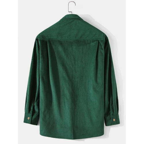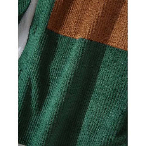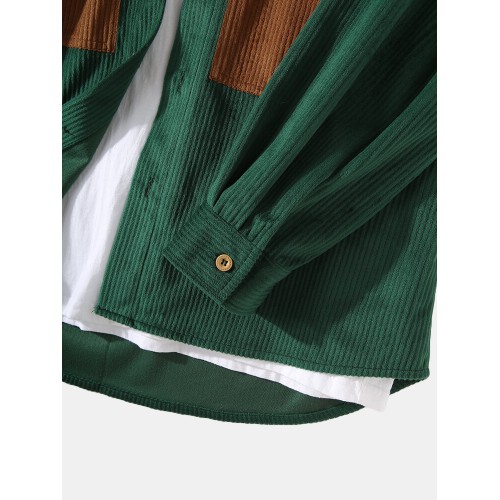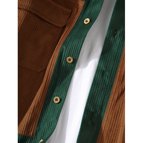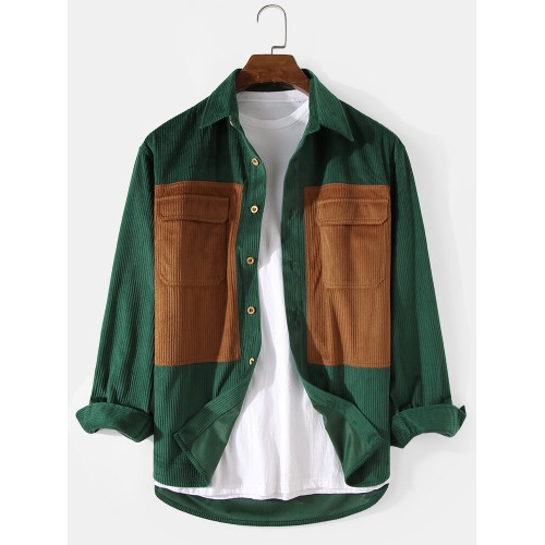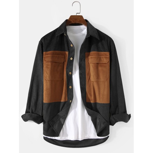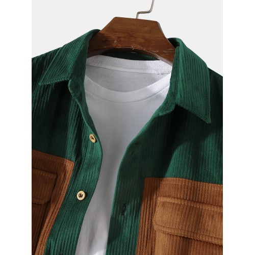 Mens Cargo Style Double Pocket Colorblock Corduroy Lapel Long Sleeve Shirts