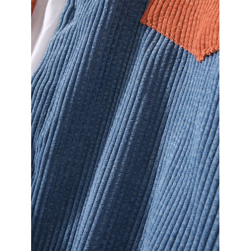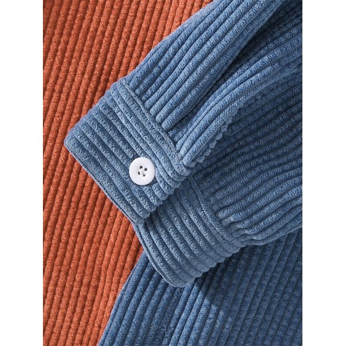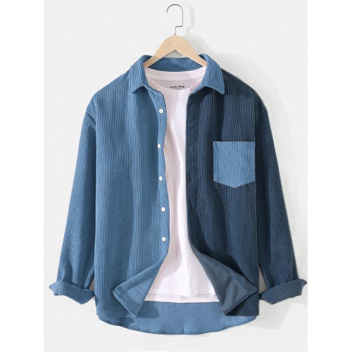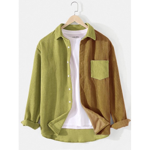 Mens Patchwork Corduroy Contrast Color Lapel Long Sleeve Shirts With Pocket