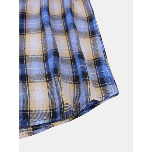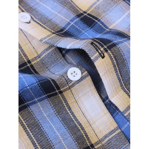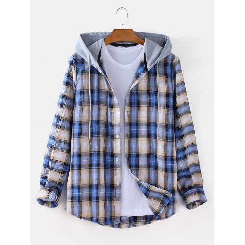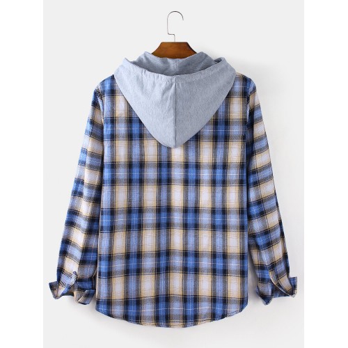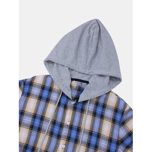 Mens Plaid Button Up Long Sleeve Casual Loose Drawstring Hooded Shirts
