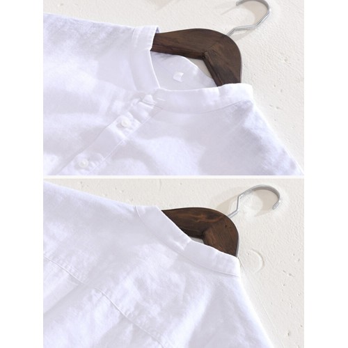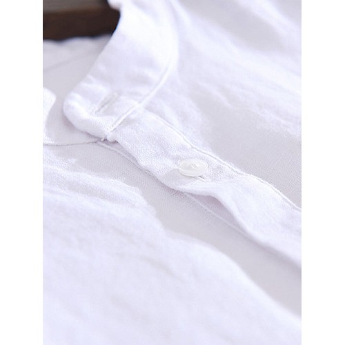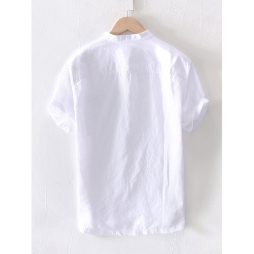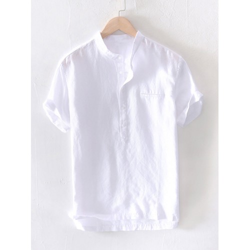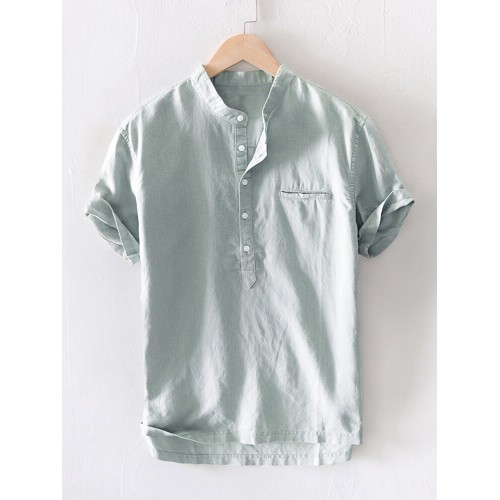 Mens Cotton Linen Stand Collar Slim Fit Short Sleeve Henley Shirt