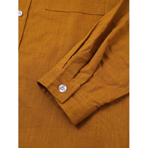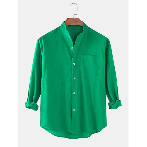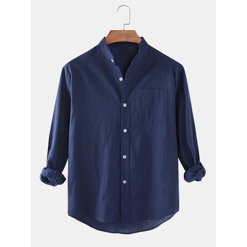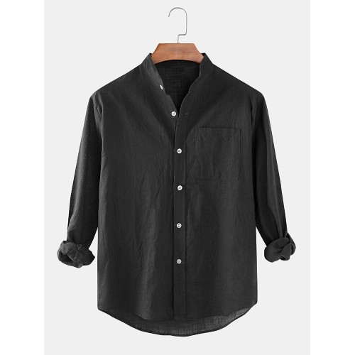 Mens Cotton & Linen Solid Color Thin Casual Long Sleeve Shirts With Pocket