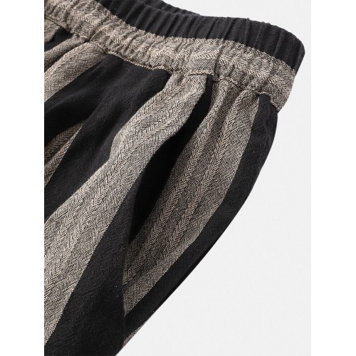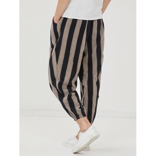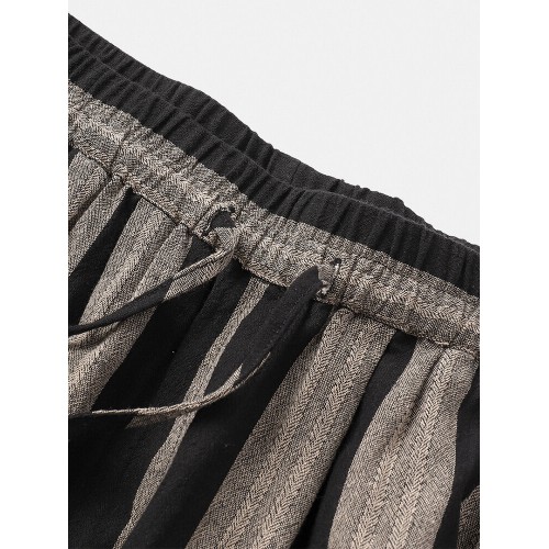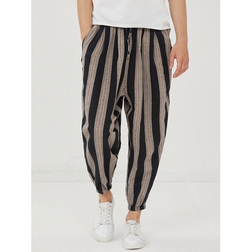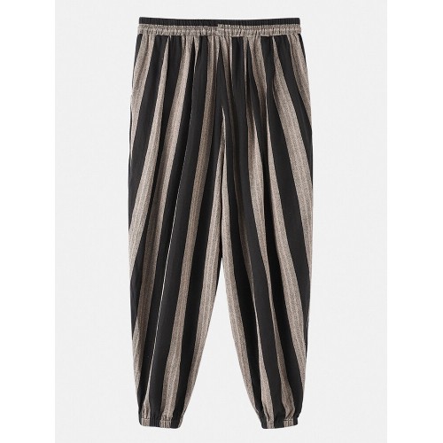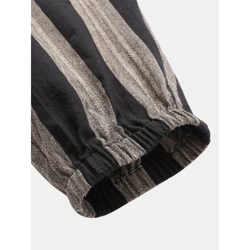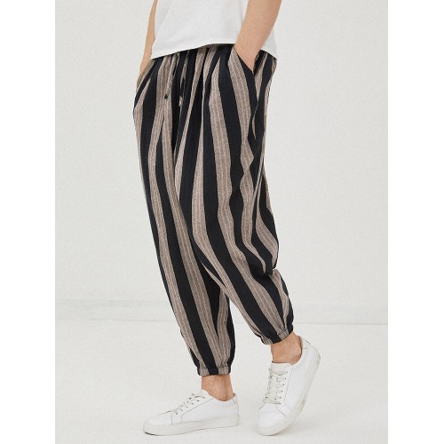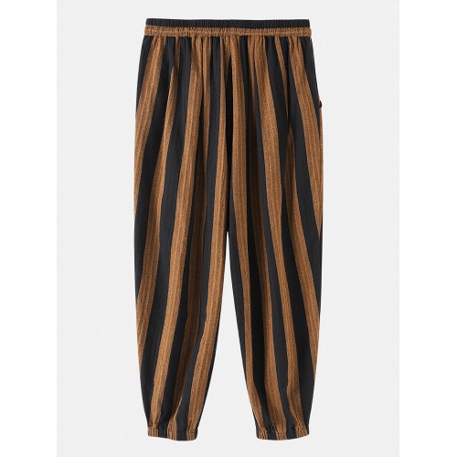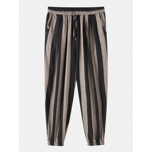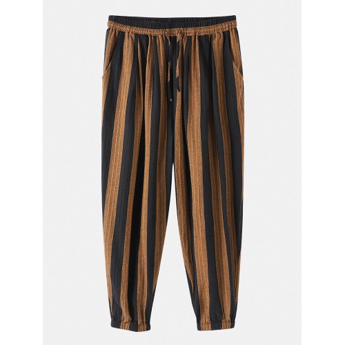 Mens 100% Cotton Striped Loose Drawstring Waist Casual Harem Pants