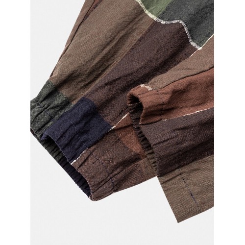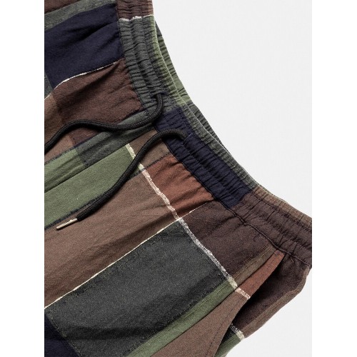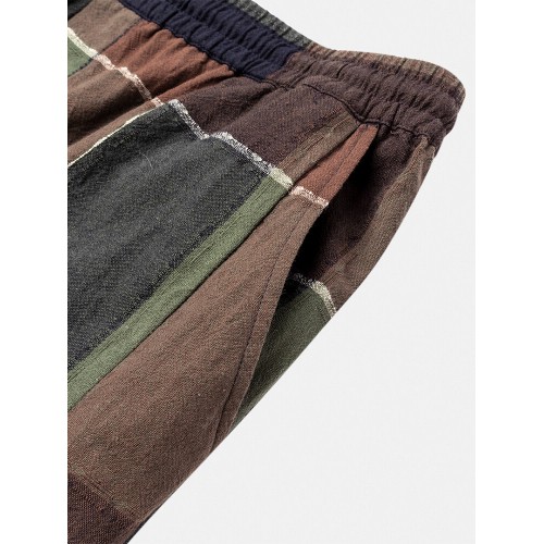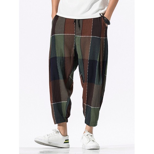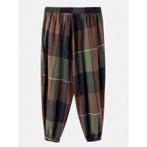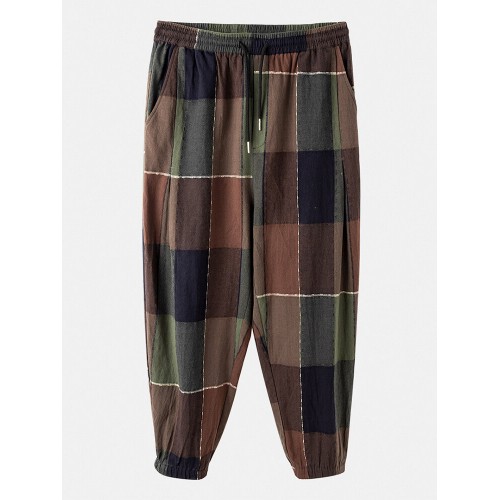 Mens Cotton Plaid Print Casual Loose Drawstring Waist Harem Pants