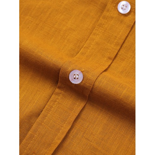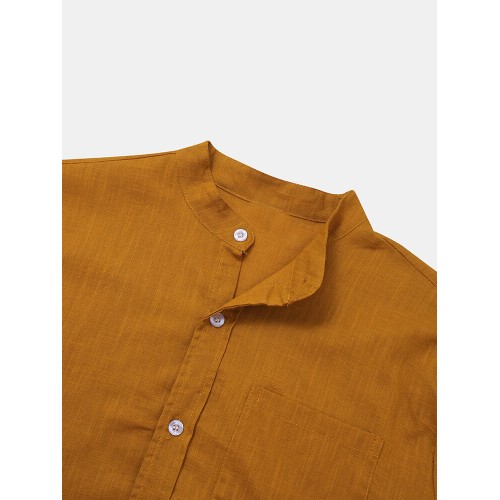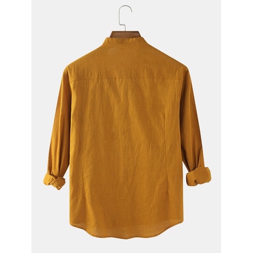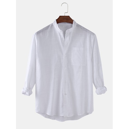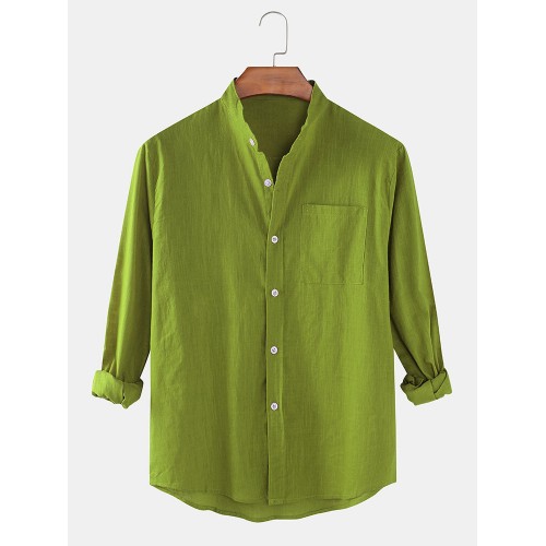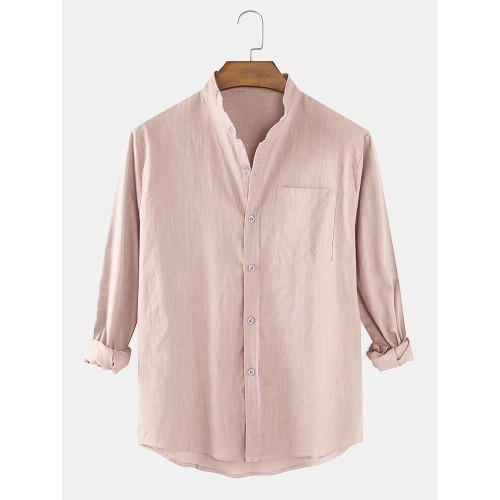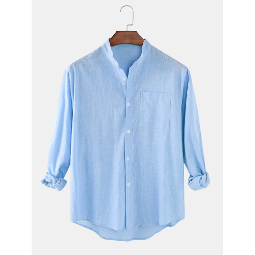 Mens Cotton & Linen Solid Color Thin Casual Long Sleeve Shirts With Pocket